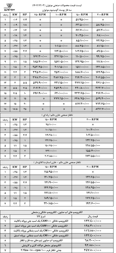 لیست قیمت الکتروموتورهای سه فاز و تک فاز صنعتی موتوژن