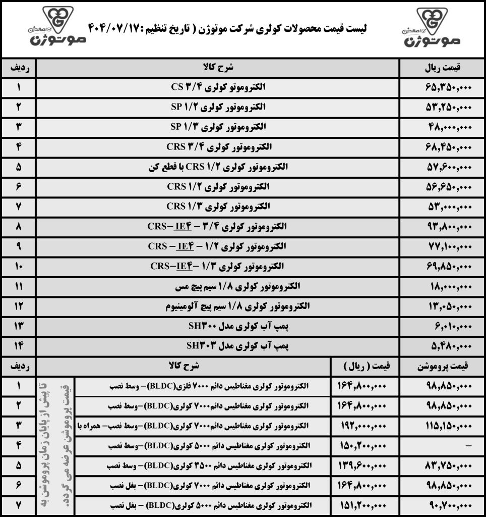 لیست قیمت الکتروموتور و الکتروپمپ های کولری موتوژن